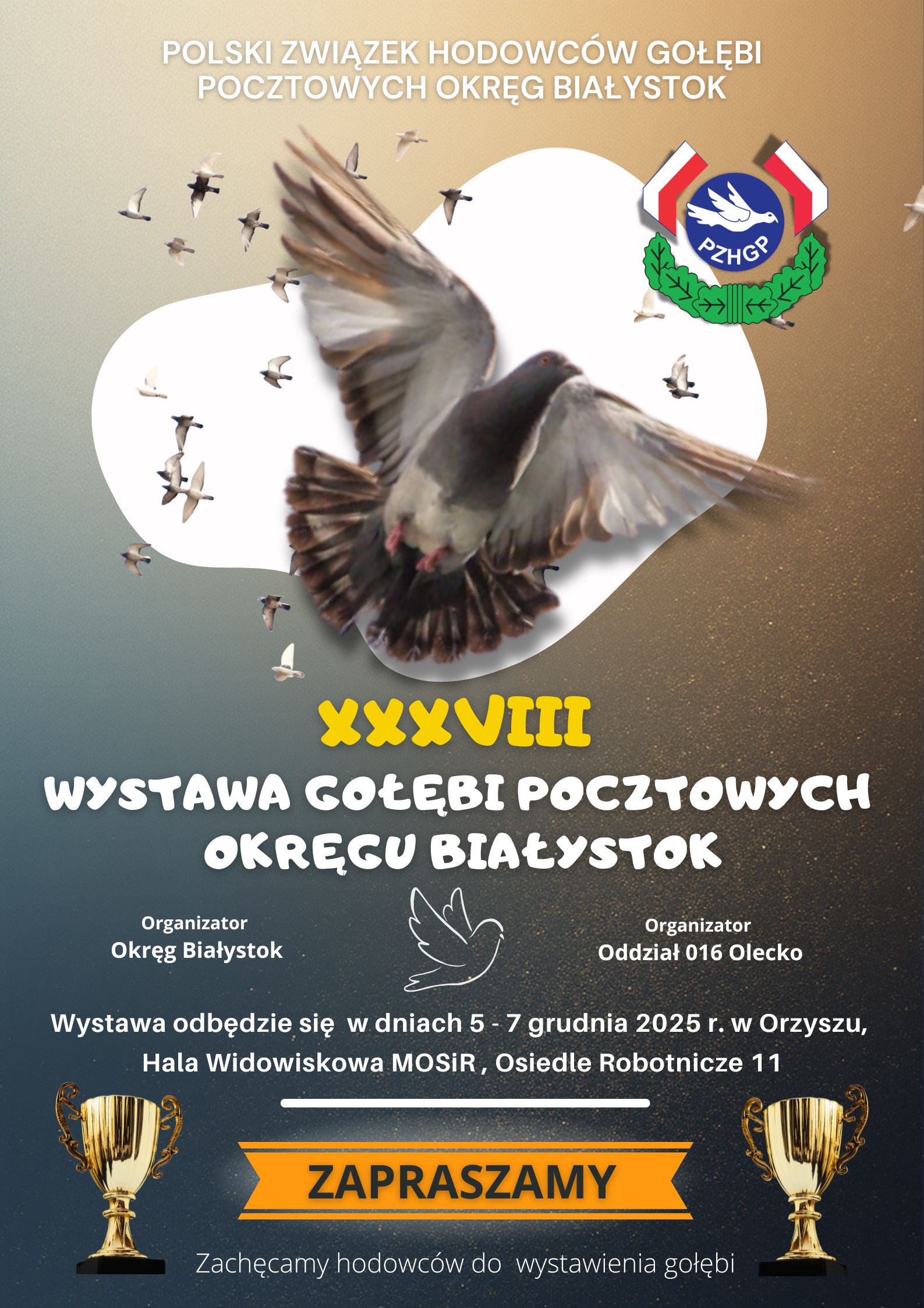 Informujemy hodowców Okręgu Białystok, iż gospodarzem - organizatorem tegorocznej wystawy okręgowej jest Oddział 012 Białystok. Wystawa planowana jest na 10-12 grudnia 2021 roku w Dobrzyniewie Dużym, ul. Szkolna 14. Forma wystawy uzależniona jest od sytuacji epidemicznej jaka panuje w naszym kraju. Jesteśmy jednak zobligowani do wyłonienia reprezentacji naszego Okręgu Białystok na 70 Ogólnoplską Wystawę Gołębi Pocztowych, która odbędzie się w dniach 7-9 stycznia 2022 r. w Katowicach. Szczegółówy komunikat dotyczący wystawy, klasy wystawowe podano w poniższym linku. Zachęcamy hodowców do zgłoszenia swoich gołębi.